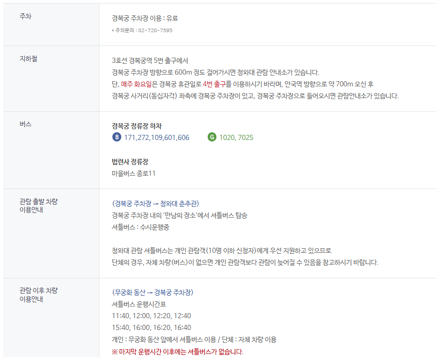 - 광화문역 2번 출구 앞 정류장: 01번 순환버스를 이용하여 '청와대' 정류장에서 하차합니다.